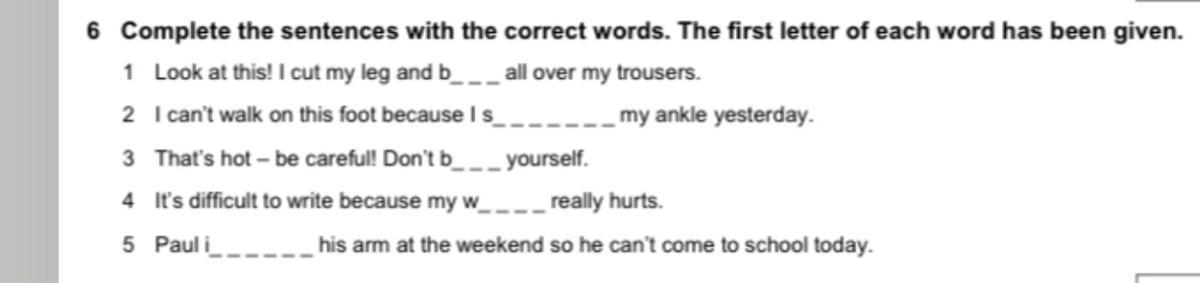 5. Paul injured his arm at the weekend so he can't come to school today.