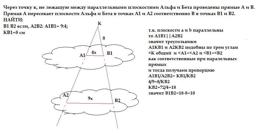 Через точку к, не лежащую между параллельными плоскостями Альфа и Бета проведены прямые A и B. Прямая А пересекает плоскости Альфа и Бета в точках A1 и A2 соответственно В в точках B1 и B2.