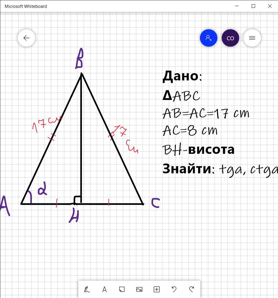 Бічна сторона рівнобедреного трикутника дорівнює 17 см а висота проведена до основи 8 см знайдіть синус косинус тангес і котангес кута при основі трикутника