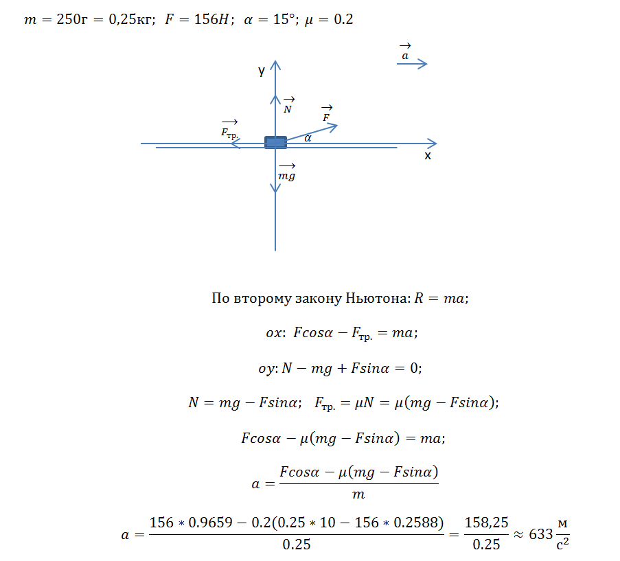 Деревянный брусок массой 250 г. перемещается по горизонтальной плоскости под действием силы 156H, направленной под углом 15 градусов к горизонту. Коэффициент трения бруска о плоскость 0,2. Определить ускорение движения тела