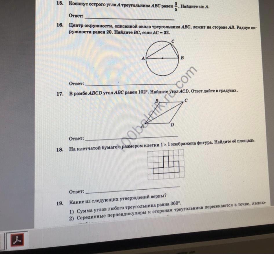 16. Если центр описанной окружности лежит на одной из сторон тр-ка, значит эта сторона будет диаметром этой окружности, а сам треугольник - прямоугольным, поскольку на диаметр опирается вписанный угол равный 90°. Таким образом, AB=2R=2*20=40. BC=√(AB²-AC²)=√(1600-1024)=√576=24