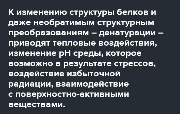 К изменению структуры белков и даже необратимым структурным преобразованиям – денатурации – приводят тепловые воздействия, изменение рН среды, которое возможно в результате стрессов, воздействие избыточной радиации, взаимодействие с поверхностно-активными веществами.