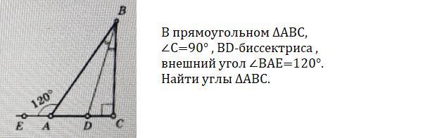 В прямоугольном ΔАВС, ∠С=90° , ВD-биссектриса , внешний угол ∠ВАЕ=120°. Найти углы ΔАВС.
