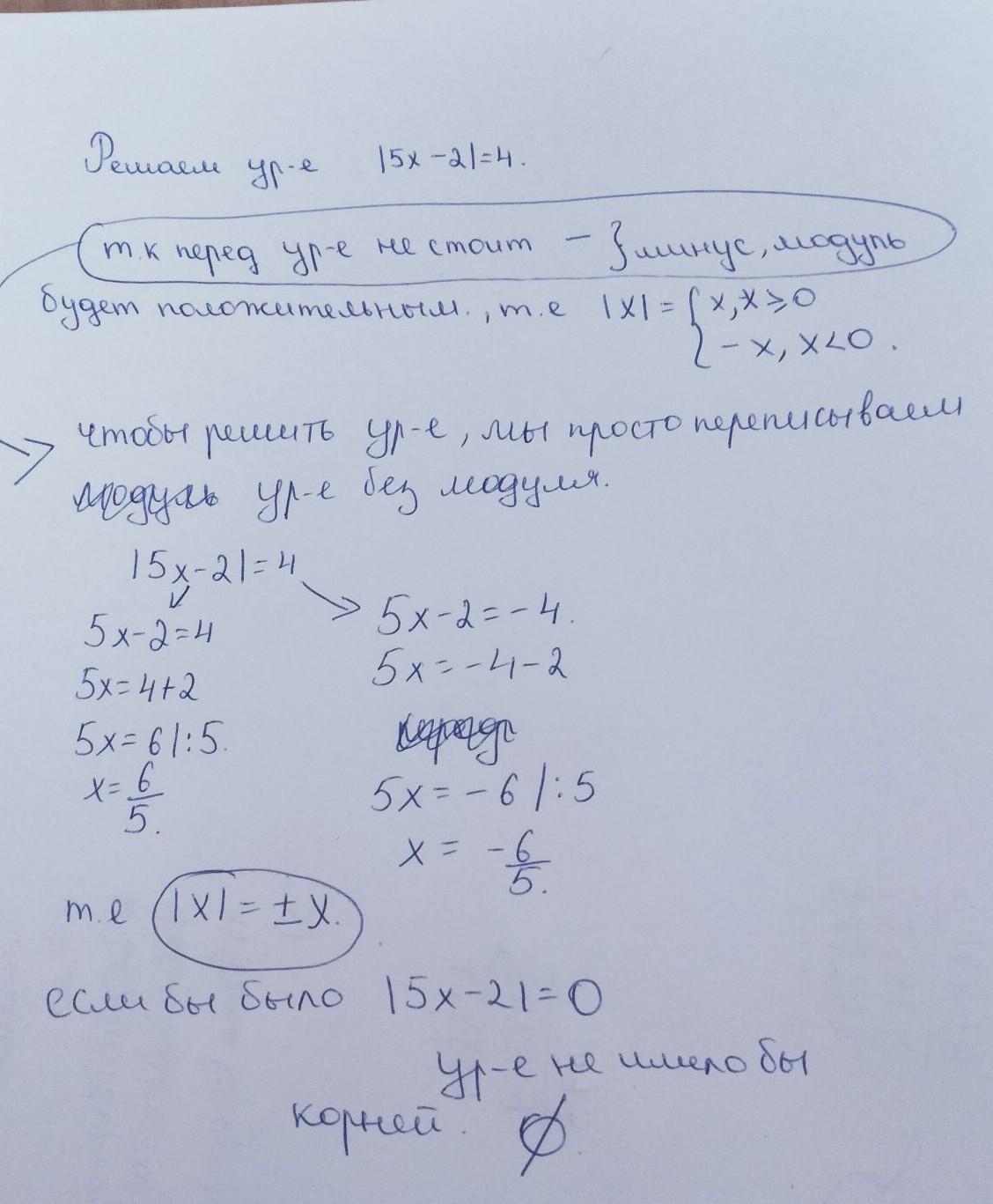 следовательно, в таких уравнениях мы пишем + и -, чтобы решить уравнение. МОДУЛЬ НЕ ПИШЕТСЯ, мы просто выписываем само уравнение без модуля. + и -. если число больше 0, тогда уравнение будет иметь 2 корня. если число меньше 0, тогда уравнение не будет иметь решения. а если |х|= 0, тогда х= 0, ПРОСТО ПЕРЕПИСЫВАЕМ УРАВНЕНИЕ и корень уравнения будет ОДИН.