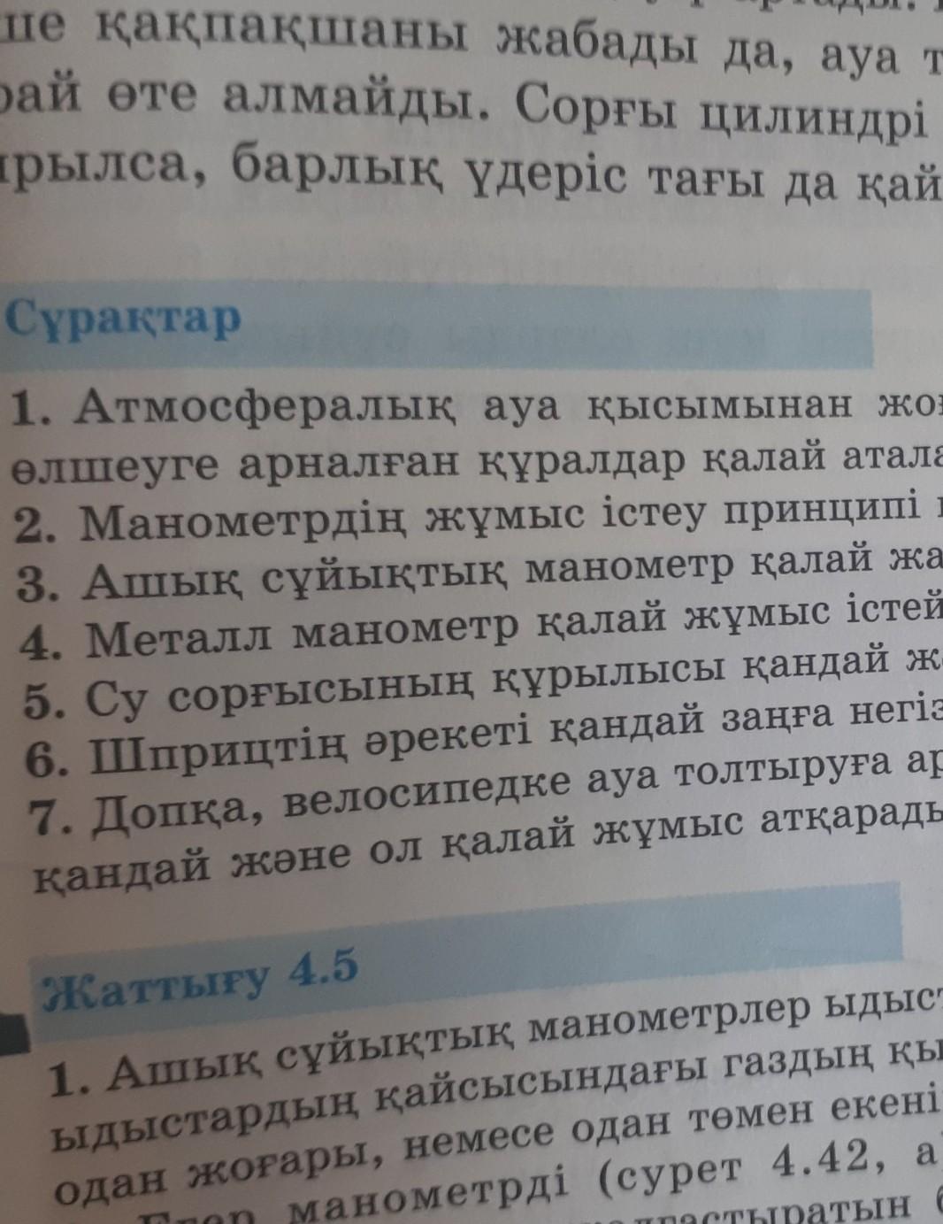 көрсетілген су сорғысынын әрекеті де атмосфералық қысымның әрекетіне негізделген. Су сорғысы ішінде қабырғаларына кептеле жоғары және төмен қарай жылжи алатын поршені бар цилиндрден тұрады. Цилиндрдің төменгі бөлігіне және поршеньнің өзіне қақпақшалар орнатылған. Поршень жоғары қарай козғалғанда, құдықтағы су атмосфералық қысымның әрекетінен құбыр бойымен көтеріліп, төменгі қақпақшаны ашады да, су поршень астындағы цилиндрге енеді. Поршень төмен қарай козғалғанда, оның астындағы су төменгі қақпақшаны басып қысады, сонда бұл қақпақша жабылады. Судың түсіретін қысымының әрекетінен поршеньнің ішіндегі қақпақша ашылады да, су жоғары көтеріліп, шүмек арқылы сыртқа құйылады. Сонымен қатар құбыр бойымен жаңадан су көтеріліп, төменгі қақпақша арқылы поршень астына енеді. Поршень қайтадан төмен қарай козғалғанда, бұл су жоғары көтеріледі, осылай қайталана береді.