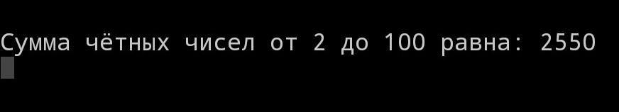 - Writeln('Сумма чётных чиcел от 2 до 100 равна:',s);
