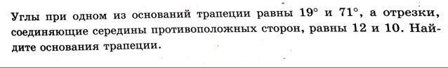 Углы при одном из оснований трапеции равны 19* и 71*, а отрезки, соединяющие середины противоположных сторон, равны 12 и 10. Найти основания трапеции.