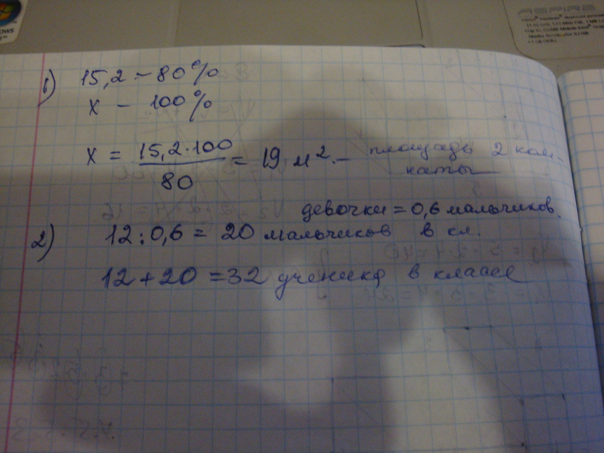 1)Площадь одной комнаты равна 15,2 м2, что составляет 80% площади второй комнаты. Какова площадь второй комнаты?