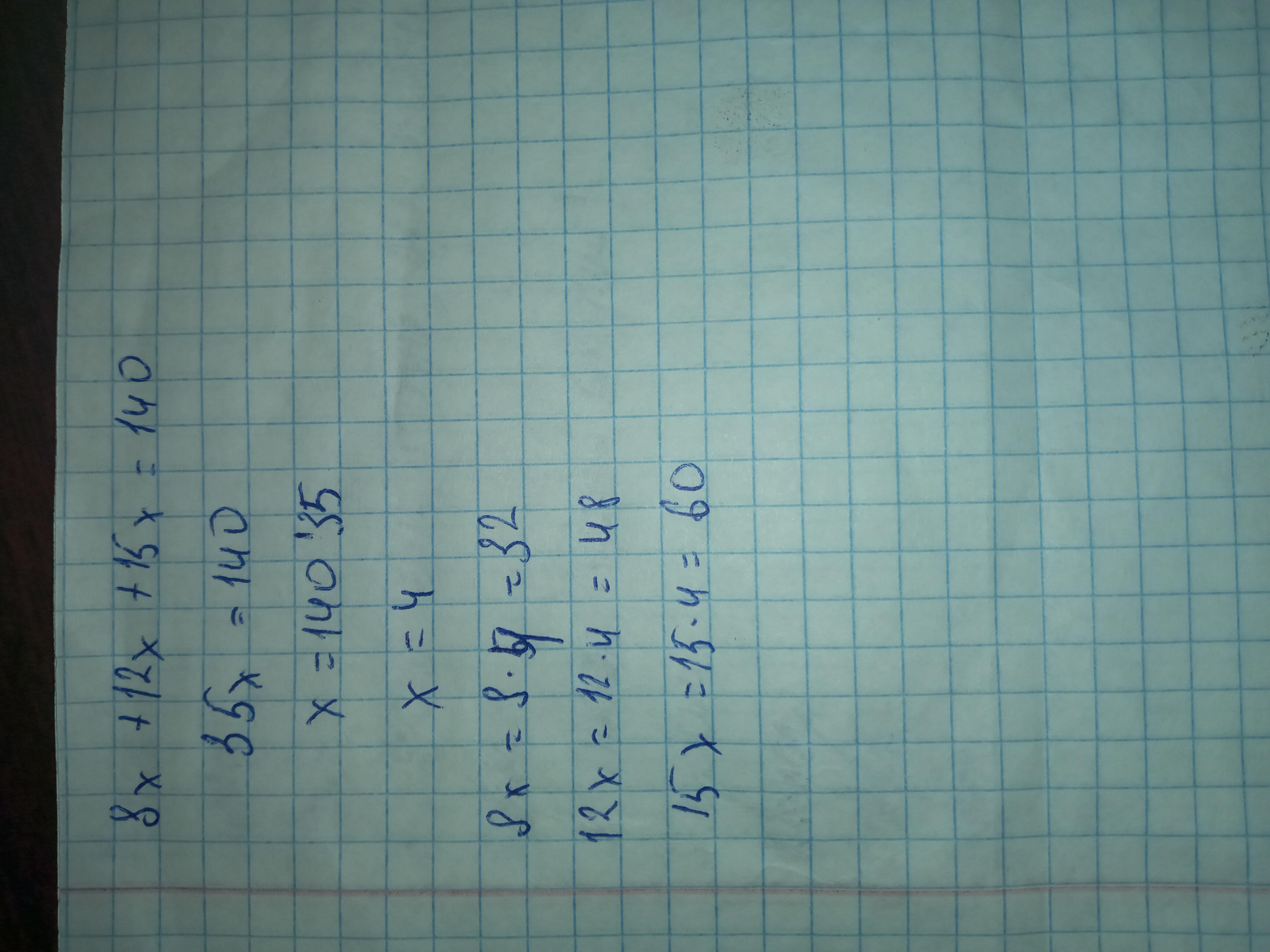 Периметр трикутника дорівнює 140 см, його сторони відносяться як 8:12:15.Знайдіть сторони трикутника