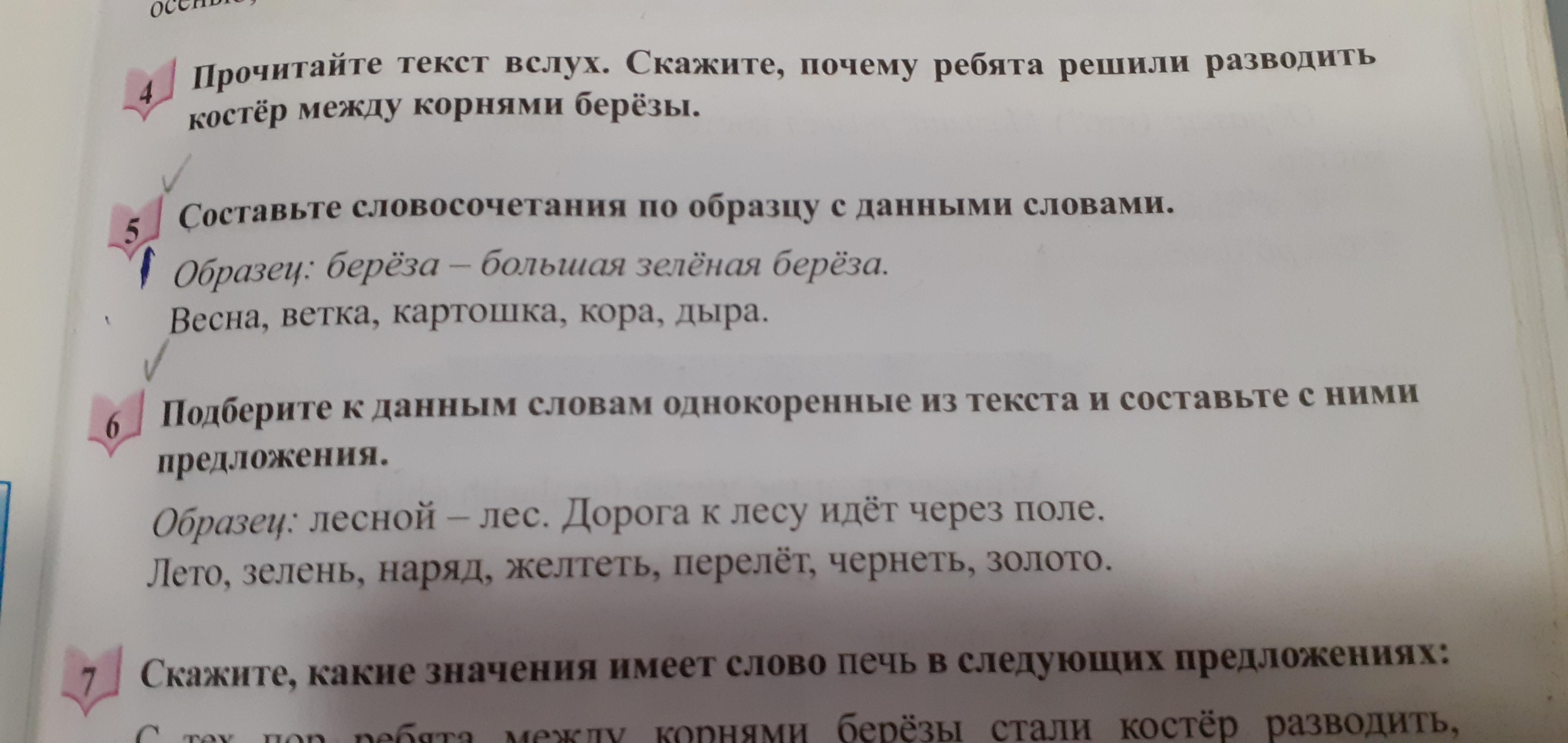 Упр 5 -Весна - ранняя весна, Ветка - сломанная ветка, картошка - вкусная картошка, кора - сушенная кора