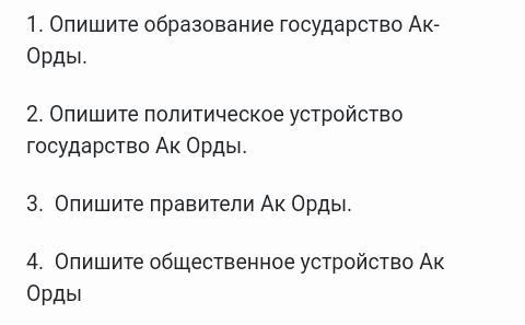 1. Ак Орда - феодальное государство, существовавшее на территории Дешт-и-Кыпчака в середине XIII - первой трети XV вв. Территория Ак Орда сформировалась постепенно, по мере ослабления её зависимости от Золотой Орды.