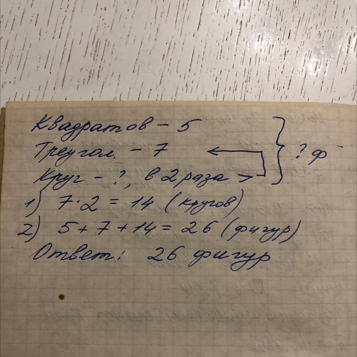 Оля вырезала из бумаги 5 квадратов, 7 треугольников, а кругов в 2 раза больше чем треугольников. Сколько всего Оля вырезала фигур?