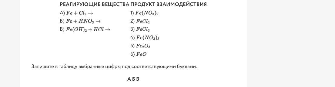 Установите соответствие между реагирующими веществами, вступающим в реакцию, и продуктом, содержащим железо, который образуется в данной реакции. К каждой позиции, обозначенной буквой, подберите соответствующую позицию, обозначенную цифрой.