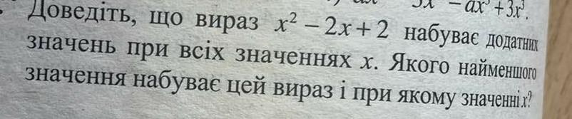 Докажите, что выражение х * - 2х + 2 приобретает додатниу значений при всех значениях х. Какого наименьшего значения приобретает это выражение и при котором значение?