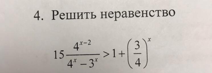 замена: t=(3/4)^x; t>0... а дробь в левой части равенства сократить на 4^х (которое не равно нулю) и получим: 1 / (16(1-t)) > 1+t обычное (уже не показательное) дробное неравенство, которое решается методом интервалов...