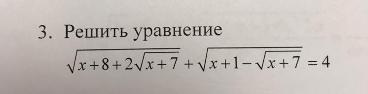 под первым корнем полный квадрат... (1 + V(x+7))^2 = 1+x+7 + 2V(x+7)... и корень извлечется даже без модуля, т.к. х>=-7... а оставшееся равенство уже можно будет просто возвести (обе части равенства, уединив корень) в квадрат...