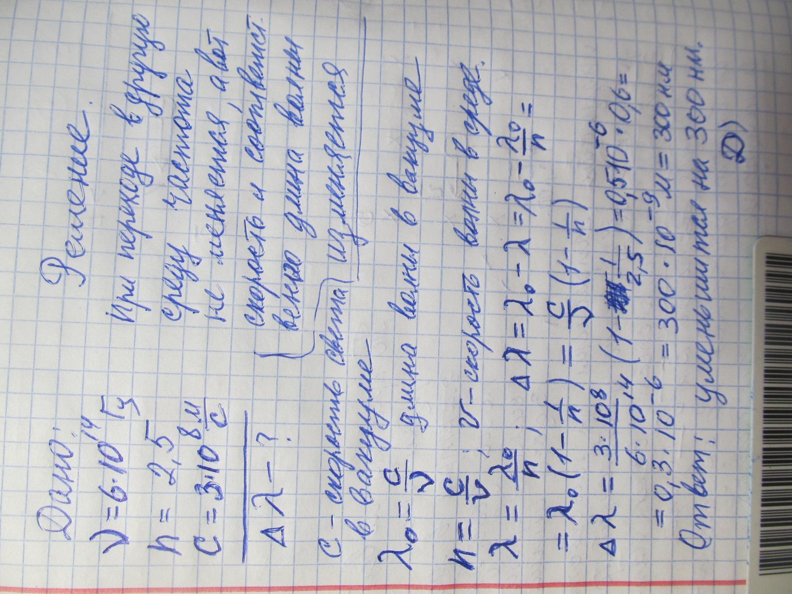 При переходе луча зеленного света с частотой 6*10^14 Гц из вакуума в среду с показателем преломления n=2.5 длина волны (c=3*10^8 м/с)