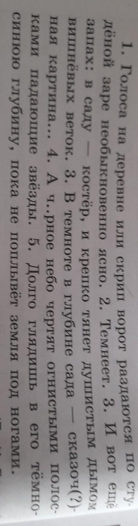 Ответ: голоса(одной чертой);на деревне(чёрточка точка);скрип(черта);ворот(чёрточка чёрточка); раздаются(двойная черта); студёной (волнистая);заре(чёрточка чёрточка); необыкновенно (чёрточка точка);ясно(чёрточка точка); темнеет (двойная черта);запах(одна черта);в саду(чёрточка точка);костёр(одна черта);крепко(чёрточка точка);тянет(двойная черта);душистым(волнистая);дымом(чёрточка чёрточка);вишнёвых(волнистая);веток(чёрточка чёрточка);в темноте (чёрточка точка);в глубине (чёрточка точка); сада (чёрточка чёрточка); сказочная (волнистая);картина(одна черта); черное (волнистая); небо (одна черта); чертят (двойная черта); огнистыми (волнистая);полосками(чёрточка чёрточка); падающие звёзды (волнистая); долго(чёрточка точка); глядишь(двойная черта); его(волнистая); темно-синюю(волнистая);глубину(чёрточка чёрточка); поплывёт(двойная черта); земля(одна черта);под ногами(чёрточка точка).