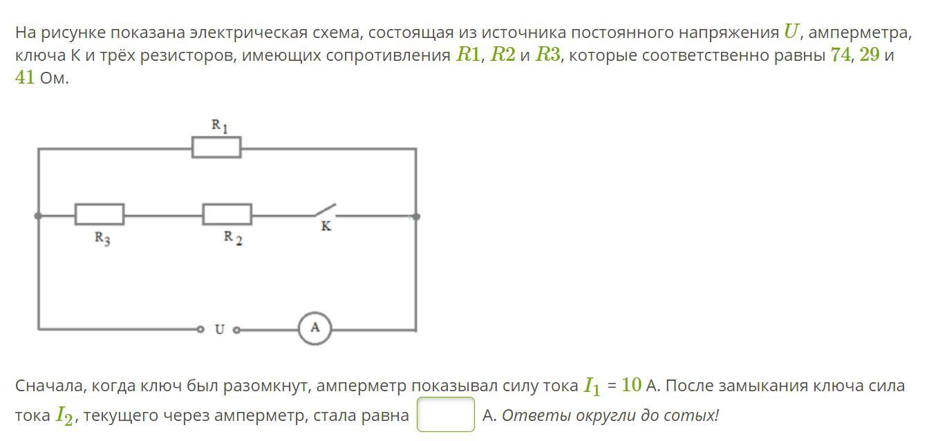 На рисунке показана электрическая схема, состоящая из источника постоянного напряжения U, амперметра, ключа К и трёх резисторов, имеющих сопротивления R1, R2 и R3, которые соответственно равны 74, 29 и 41 Ом.