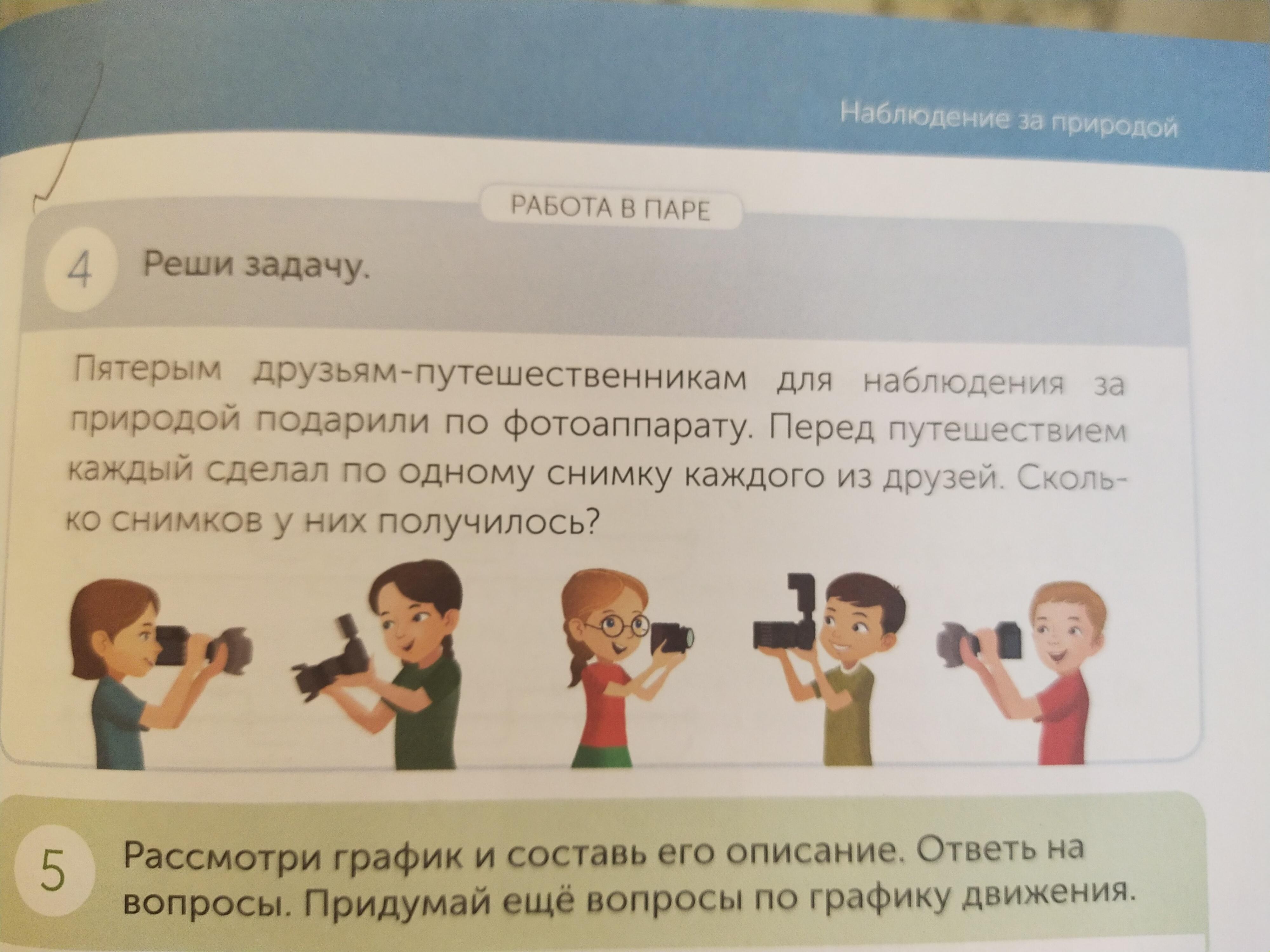 реши задачу пятерым друзьям путешественникам для наблюдения за природой и подарили по фотоаппарату перед путешествием каждый сделал по одному снимку каждого из друзей сколько снимков у них получилось дам 15 баллов срочно!