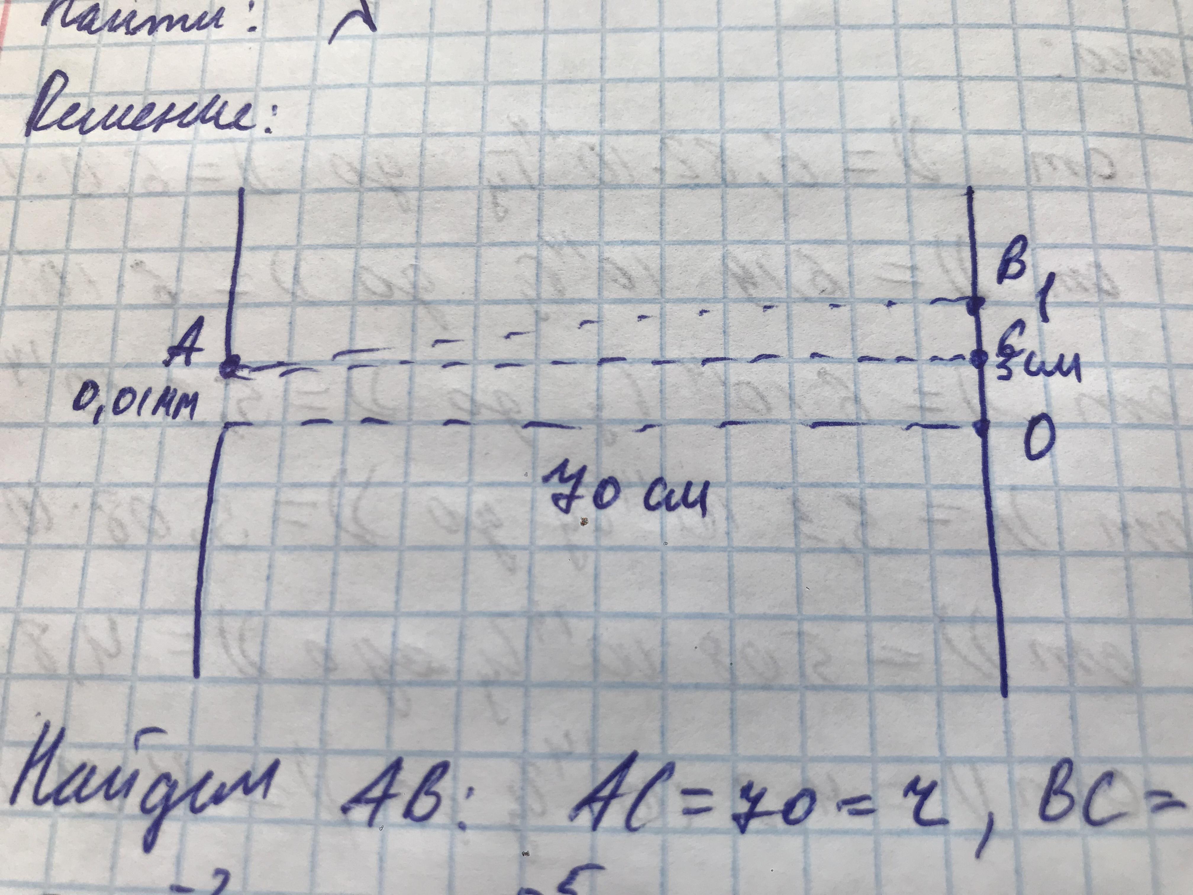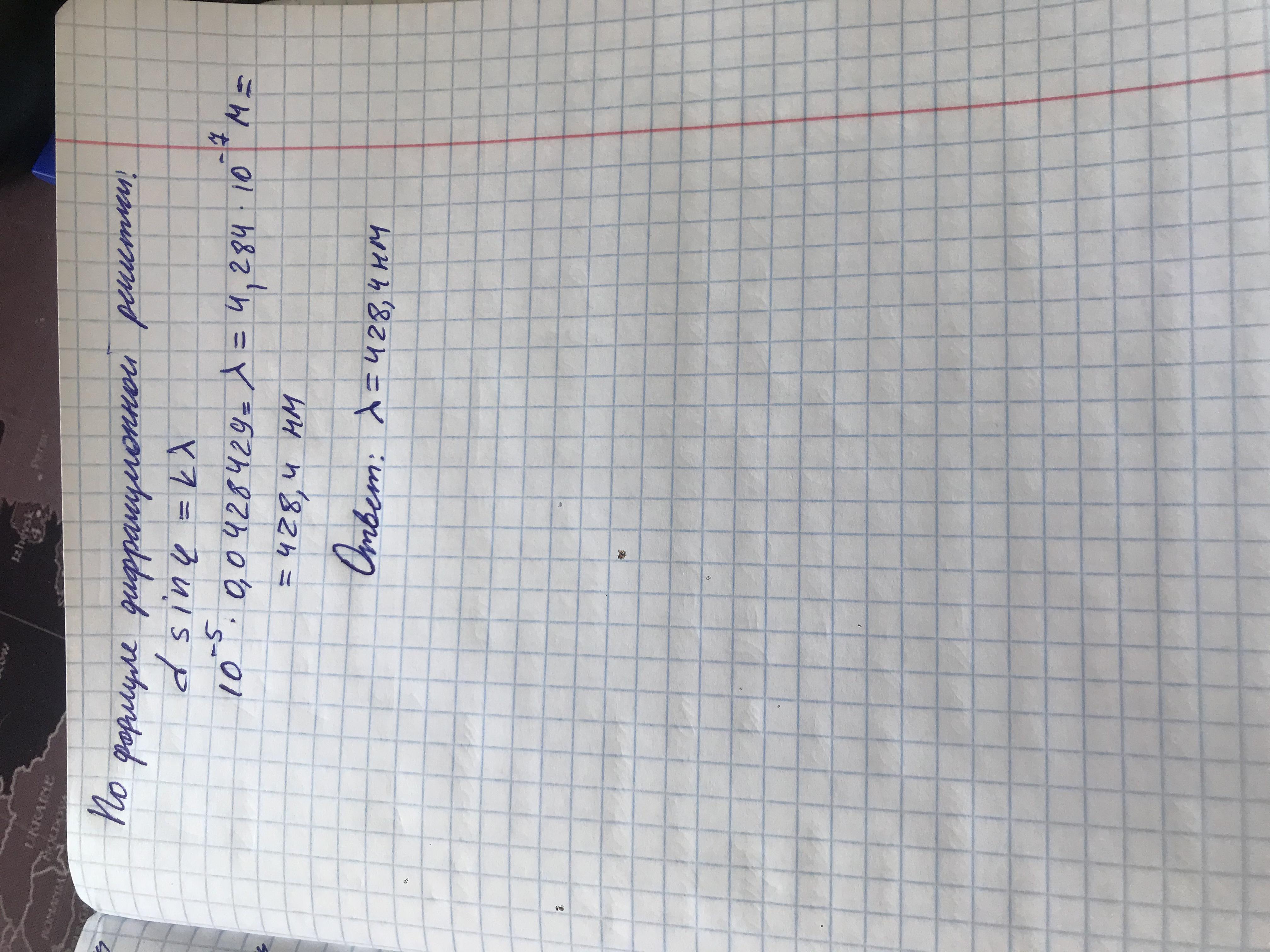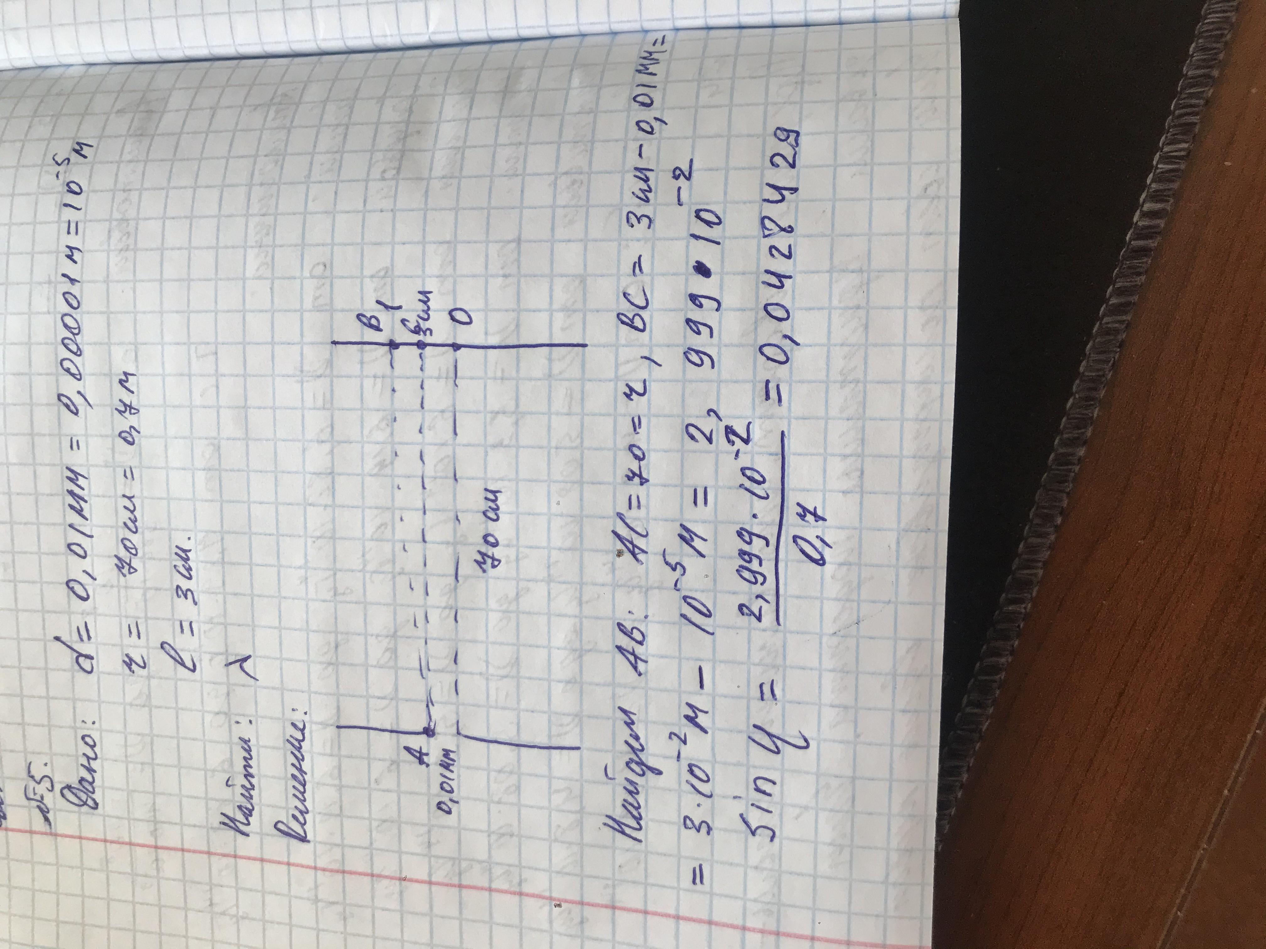 Дифракционную решетку,период которой 0,01мм,освещают монохроматическим светом. На экране,расположенном на расстоянии 70см от решетки,расстояние между нулевым и первым максимумами 3см. Найти длину световой волны.