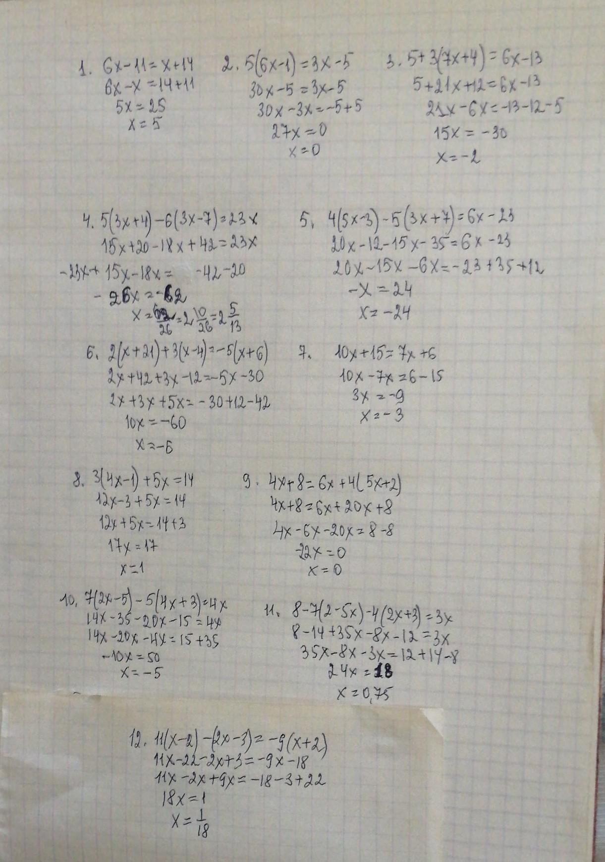 1.6x-11=x+14 3.5+3(7x+4)=6x-13