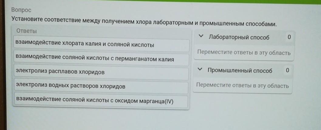 установите соотвестие между получением хлора лабораторным и промышленным способами
