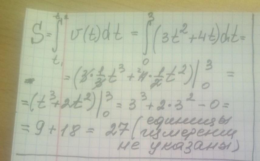 материальная точка движется прямолинейно со скоростью v(t)=3t^2+4t, найдите пройденный путь за [0;3] секунды. 11 класс, интегралами надо...