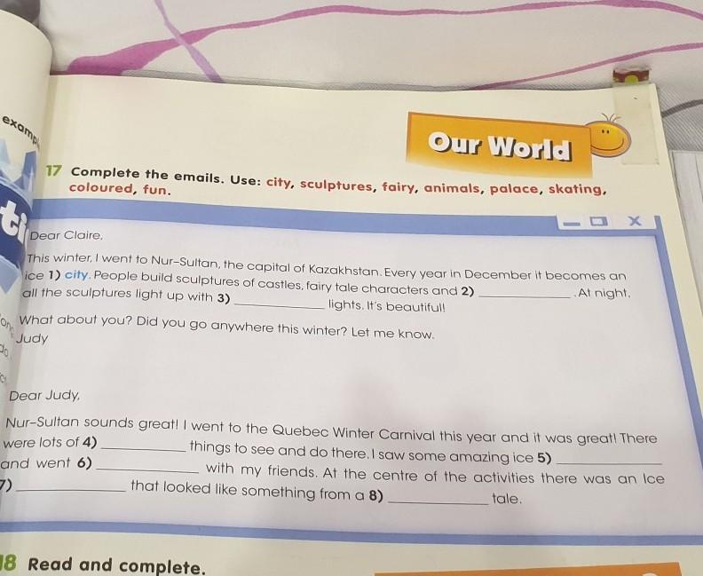 17 Complete the emails. Use: city, sculptures, fairy, animals, palace, skating.