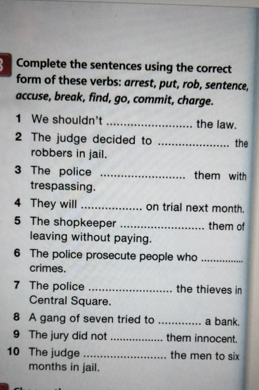 complete the sentences using correct form of these verbs: arrest, put, rob, sentence, accuse, break, find,go,commit,charge.
