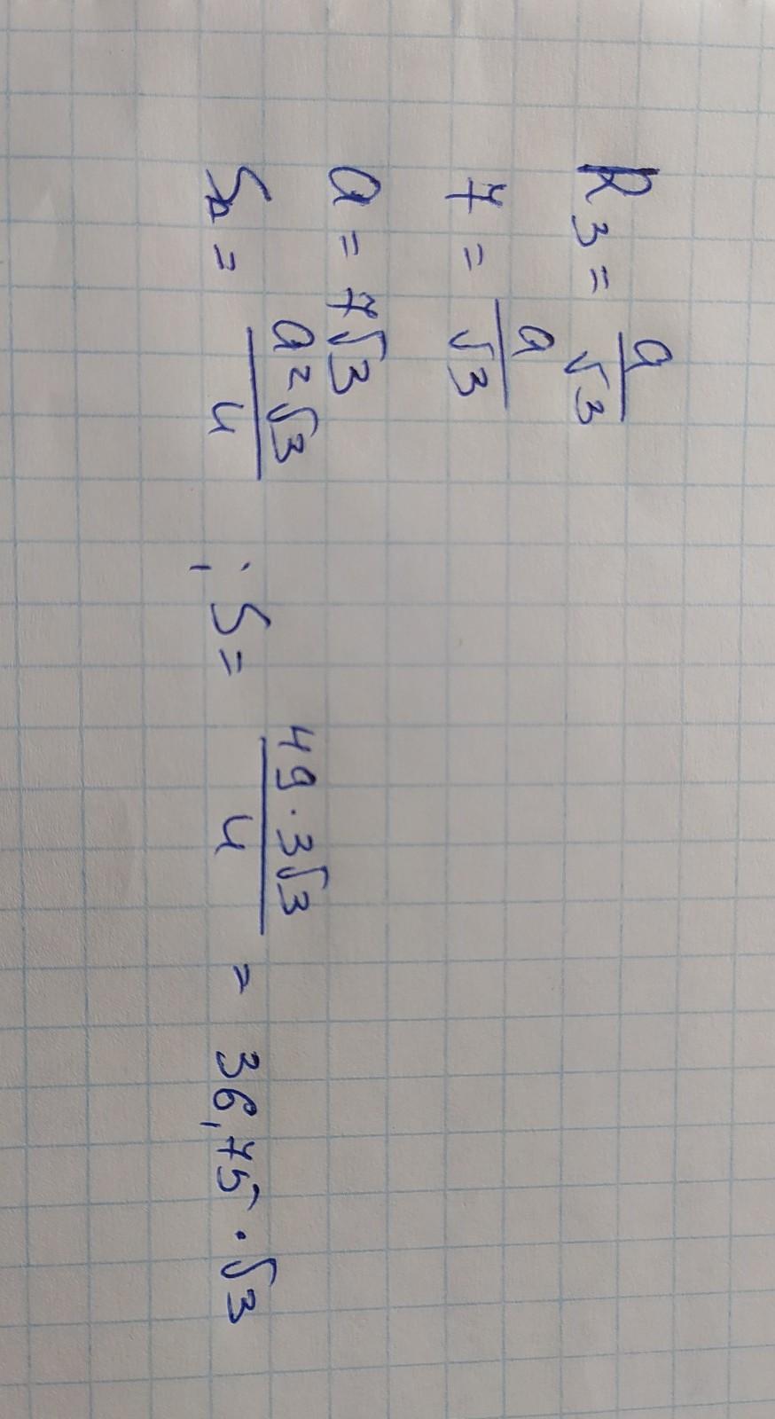 вот, первая формула это по правилу радиусов описанных окружностей около правильных фигур, а второе формула площади правильного треугольника