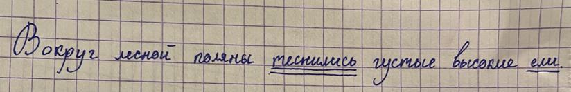 Вокруг лесной поляны (что делали?) теснились (-сказуемое) густые высокие (что?) ели (-подлежащее)