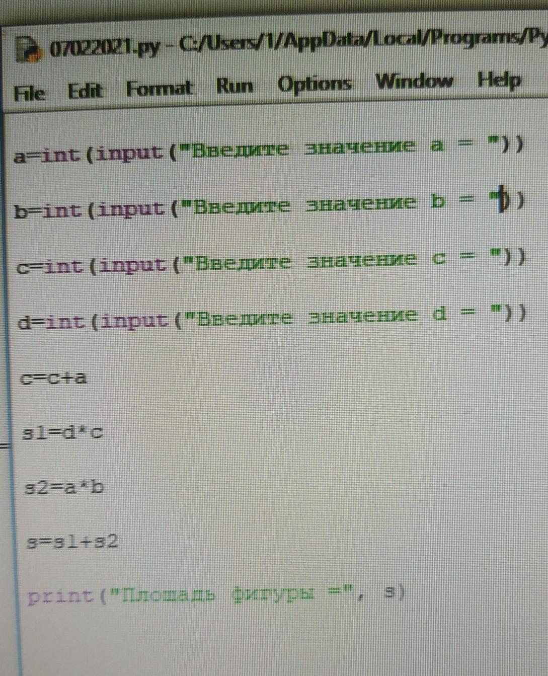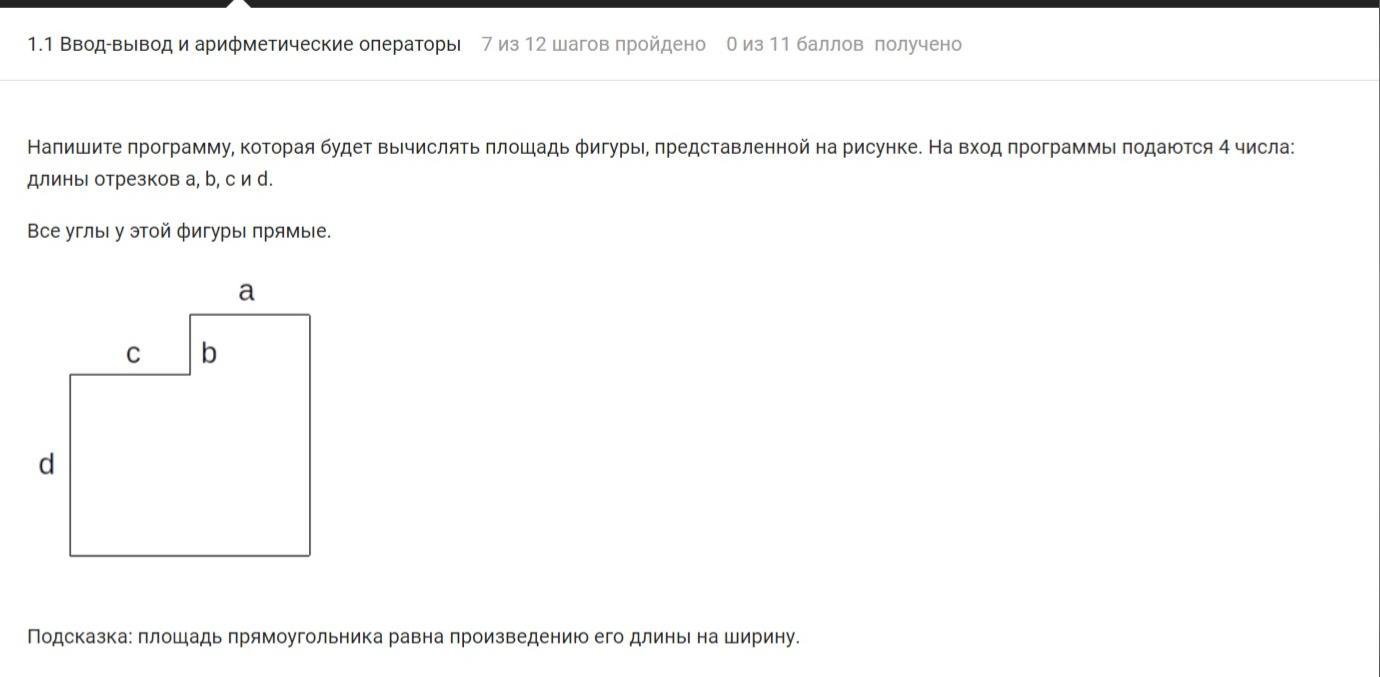 Напишите программу, которая будет вычислять площадь фигуры, представленной на рисунке. На вход программы подаются 4 числа: длины отрезков a, b, c и d.