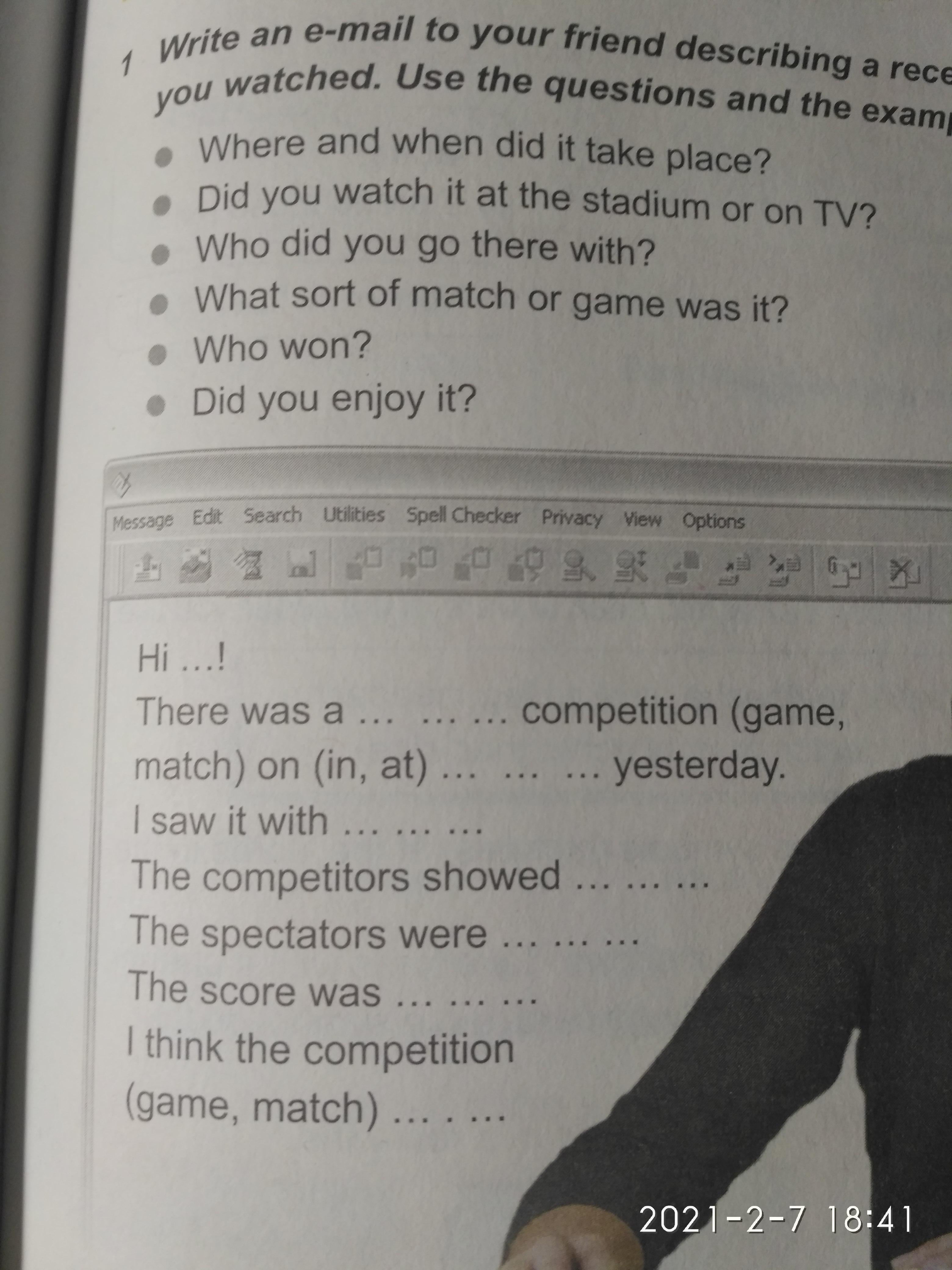 напишите своему другу электронное письмо(на английском) с описанием недавнего спортивного мероприятия, которое вы смотрели. Используйте вопросы и пример ниже