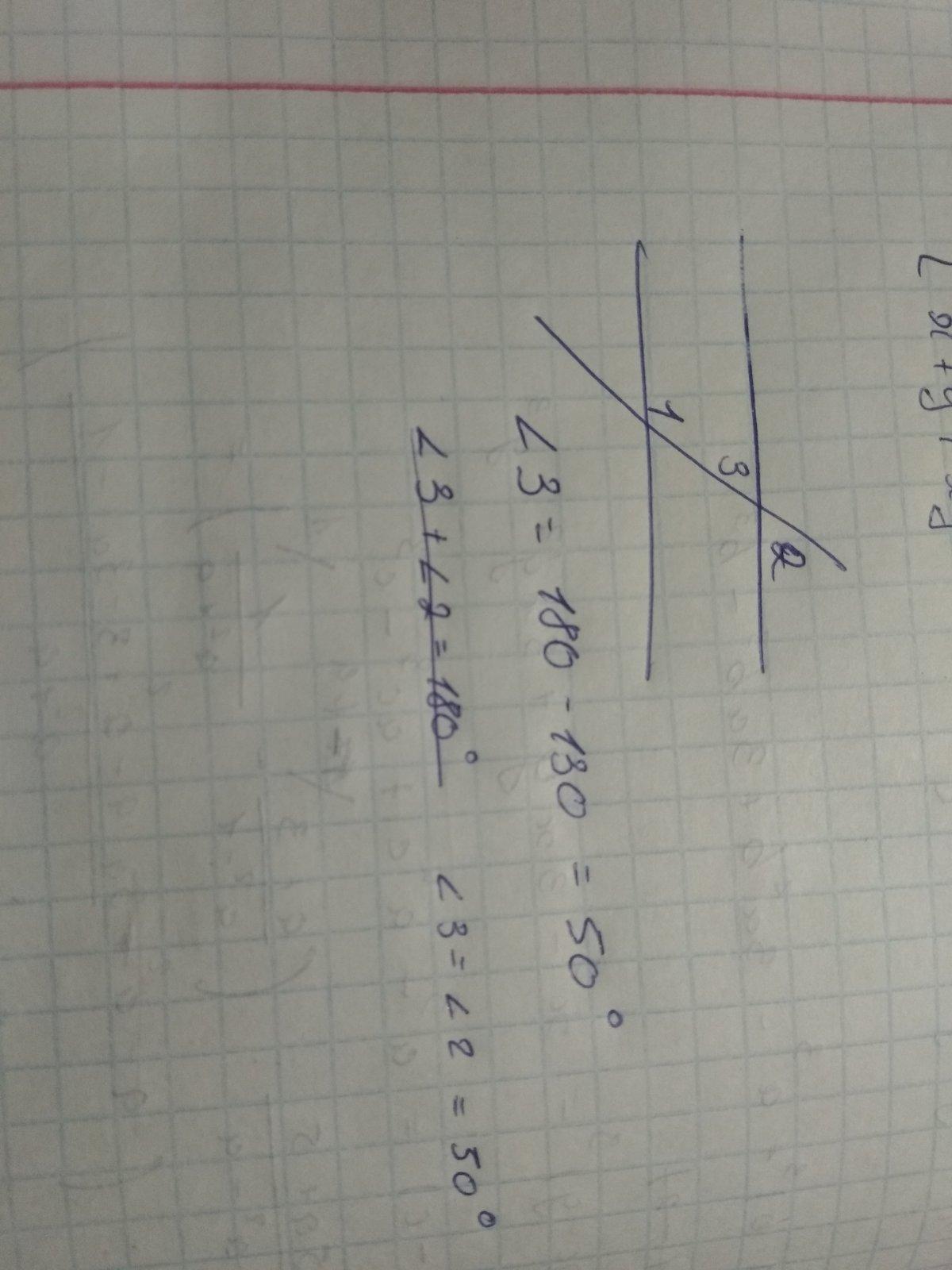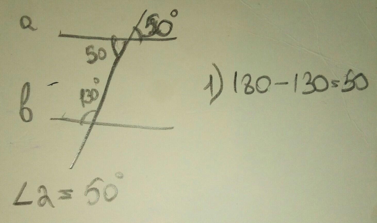 Сумма односторонних углов равна 180° , поэтому отнимаем от 180,потом вертикальные углы равны поэтому будет 50°