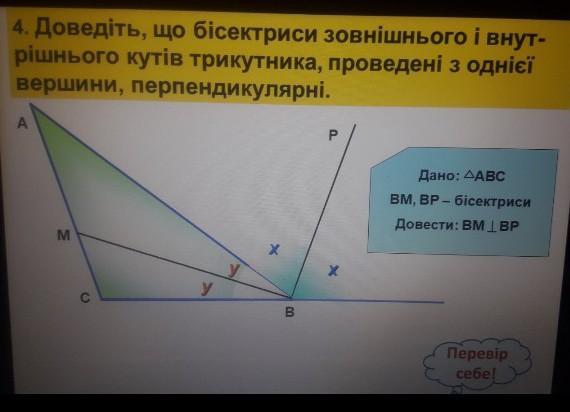 Докажи,что биссектрисы внешнего и внутреннего угла,которые проведены из одной вершины- перпендикулярны