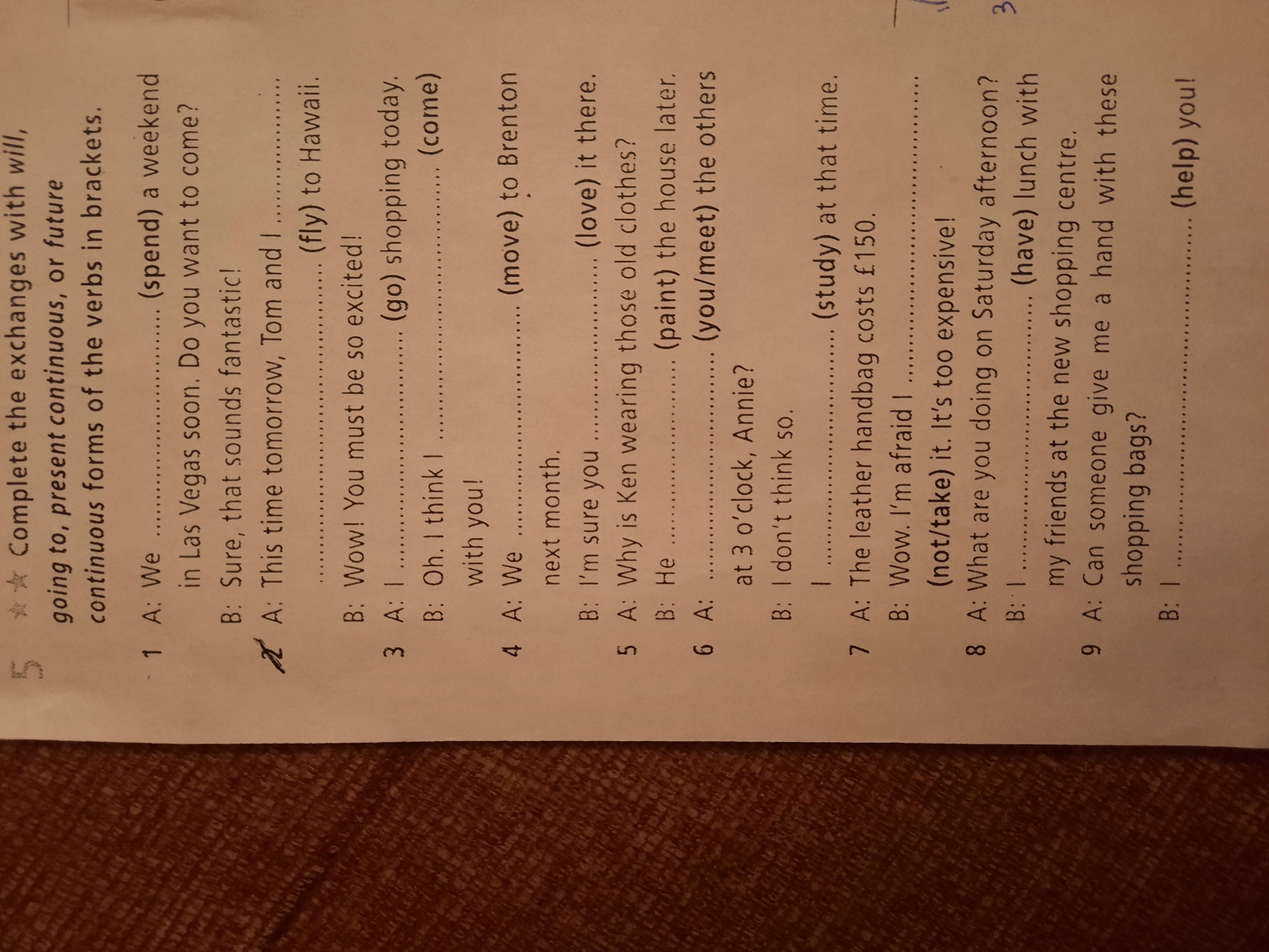 1) will spend; 2) will be flying; 3) am going/will come; 4) are going to move (are moving)/will love; 5) will paint; 6) Are you meeting (will you be meeting)/will be studying; 7) will not take; 8) am having ; 9) will help