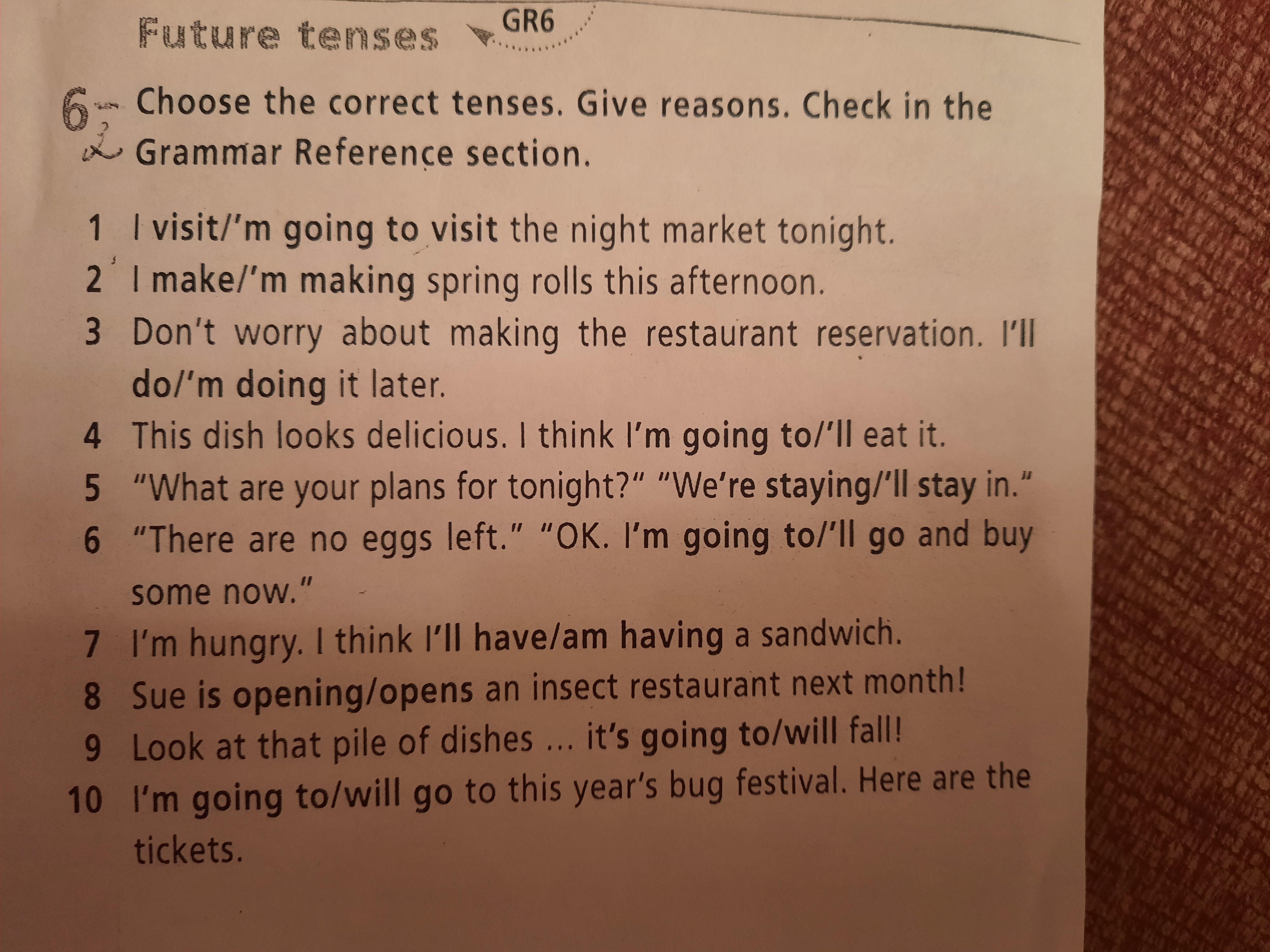 1) am going; 2) am making; 3) 'll do; 4) 'll eat it; 5) are staying; 6) 'll go; 7) 'll have; 8) is opening; 9) it's going; 10) 'm going
