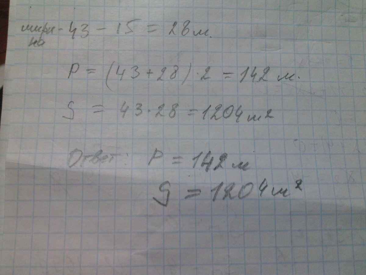 Первая задача: длина прямоугольного участка земли 43 м, а его ширина на 15 м, меньше длины . Найдите периметр и площадь участка.