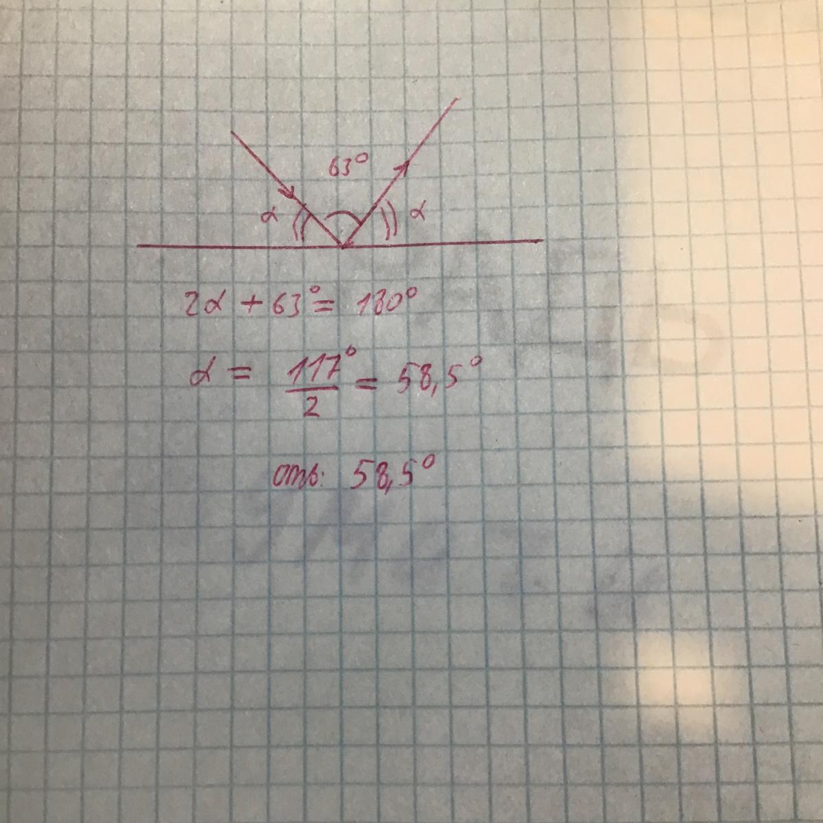 Угол между падающим и отражённым лучами 63°. Чему равен угол отражения? Чему равен угол между падающим лучом и поверхностью? Ответ должен быть полным. Сделайте ЧЕРТЕЖ
