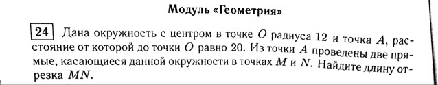 OM=12, OA=20, осталось найти МА = V((20-12)*(20+12)) = V(8*8*4) = 16