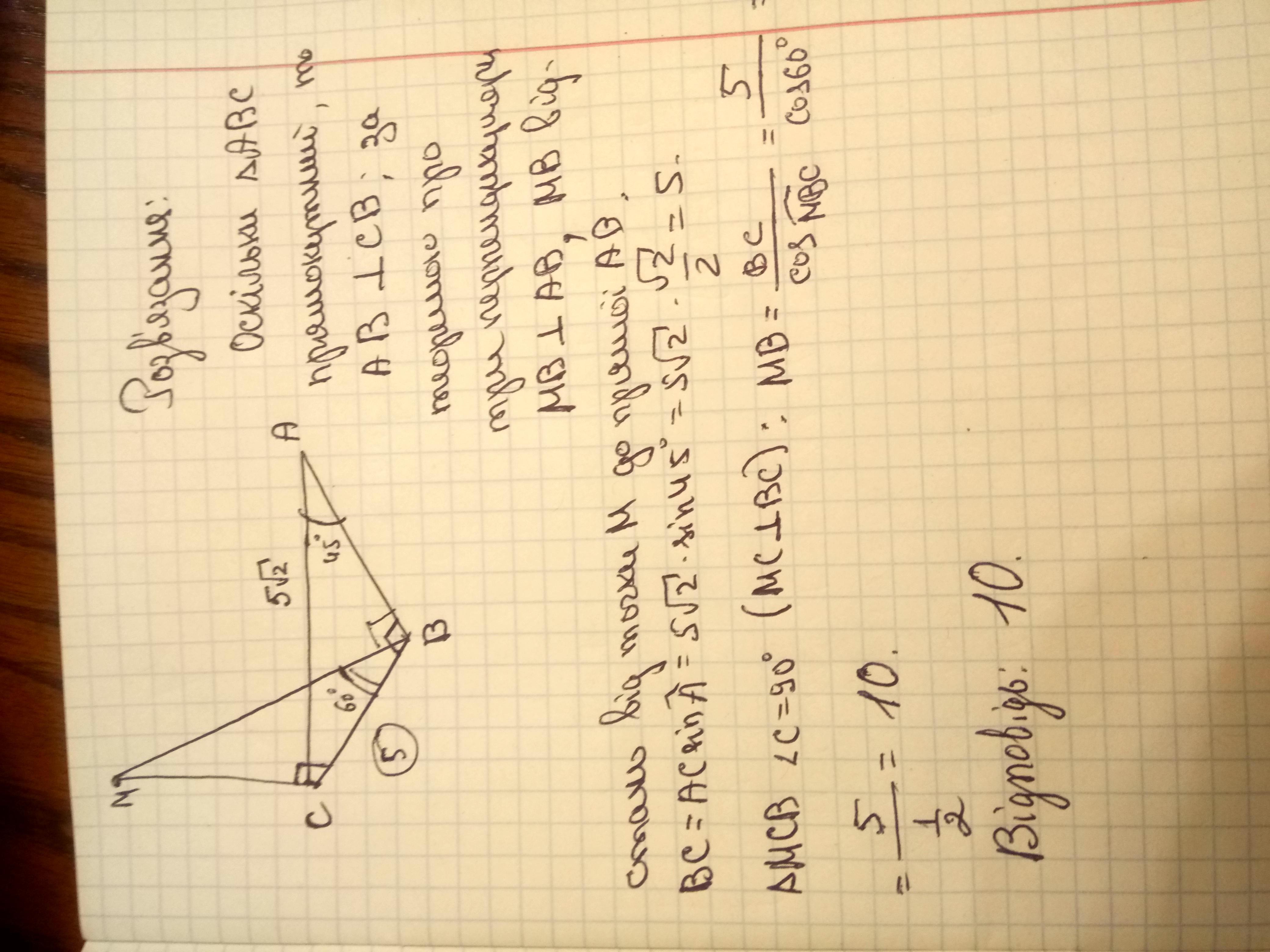 У трикутнику АВС В=90° Відрізок МС- перпендикуляр до площини трикутника. Знайдіть відстань від точки М до прямої АВ, Якщо АС= 5(корень)2, А= 45°, МВС=60°