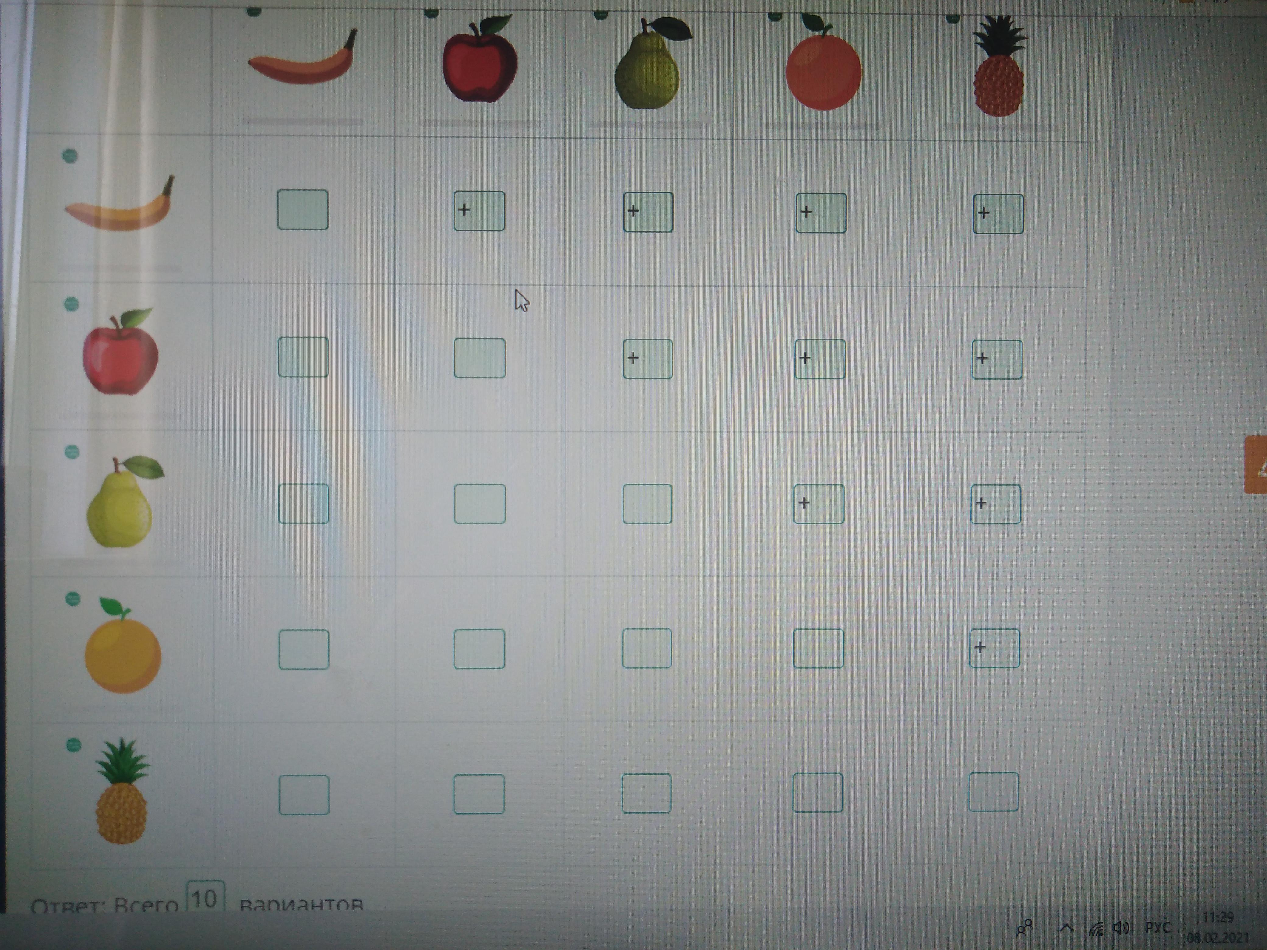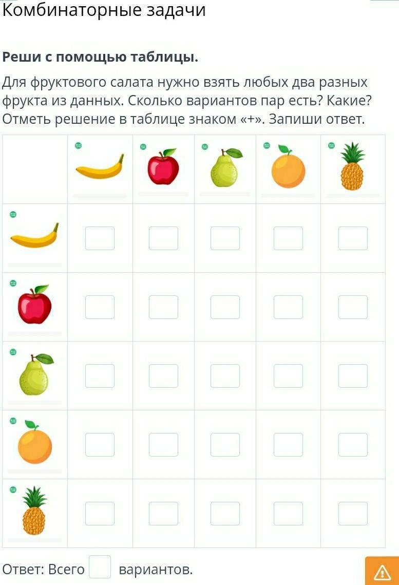 Для фруктового салата нужно взять любых два разных фрукта из данных. Сколько вариантов пар есть? Какие? Отметь решение в таблице знаком «+». Запиши ответ.