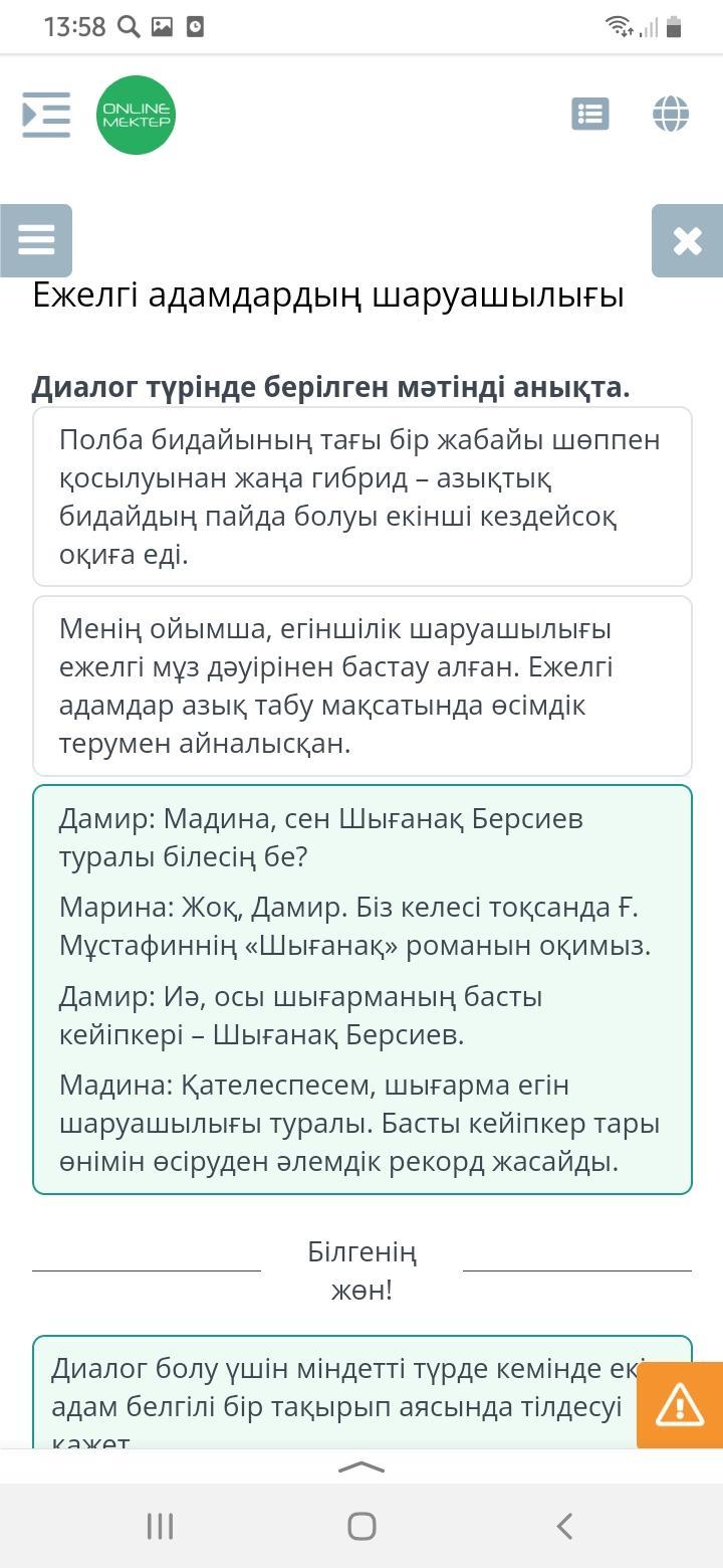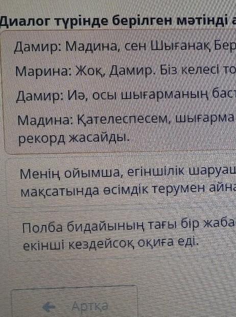 Диалог түрінде берілген мәтінді аңыкта. Дамир: Мадина,сен Шығанақ Берсиев туралы білесің бе? Марина: Жоқ, Дамир .Біз келесі тоқсанда Ғ.