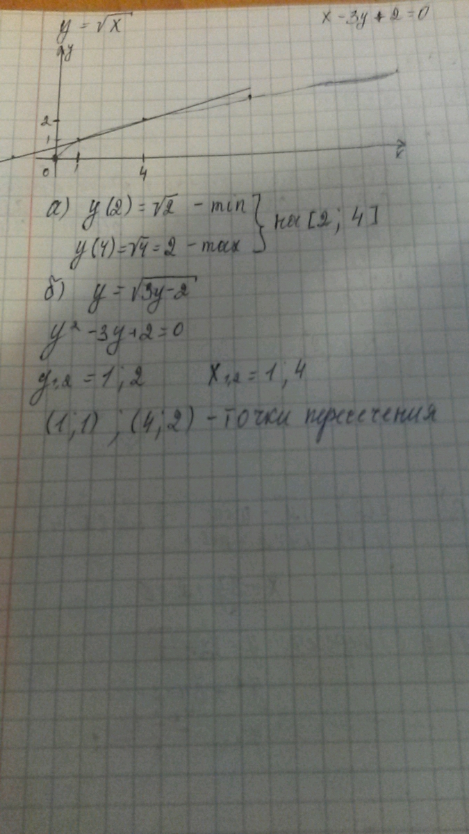 Постройте график функции y=√x. Найдите а)наименьшее и наибольшее значение этой функции на отрезке [2:4] б)кординаты точки пересечения графика этой функции с прямой x-3y+2=0