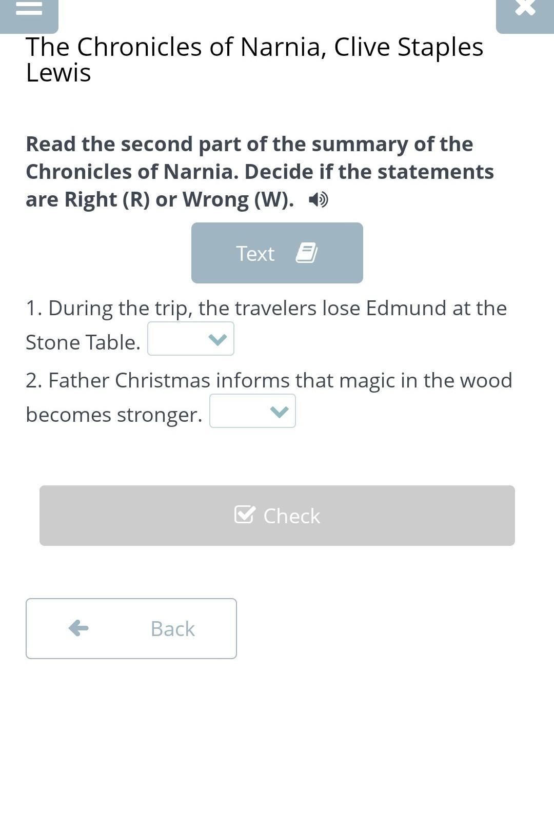 Read the second part of the summary of the Chronicles of Narnia. Decide if the statements are Right (R) or Wrong (W).