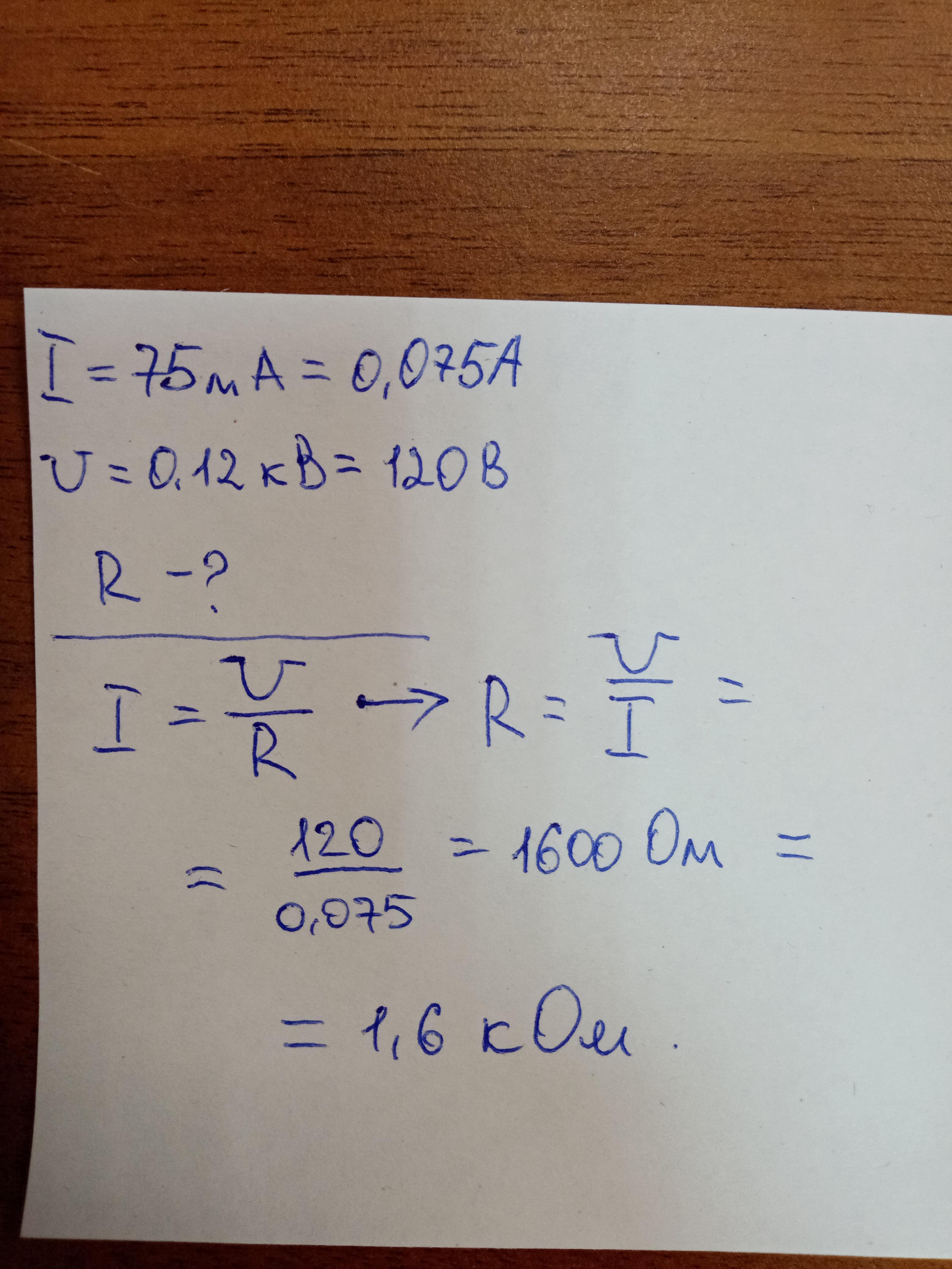Ответ: по закону Ома R=U/I=120/0,075=1600 Ом=1,6 кОм.