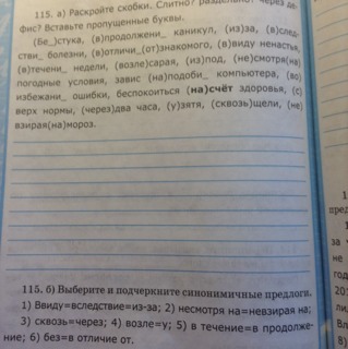 а) Без стука, в продолжение каникул, из-за, вследствие болезни, в отличие от знакомого, ввиду ненастья, в течение недели, возле сарая, из-под, несмотря на погодные условия, завис наподобие компьютера, во избежание ошибок, беспокоиться насчёт здоровья, сверх нормы, через два часа, у зятя, сквозь щели, невзирая на мороз.