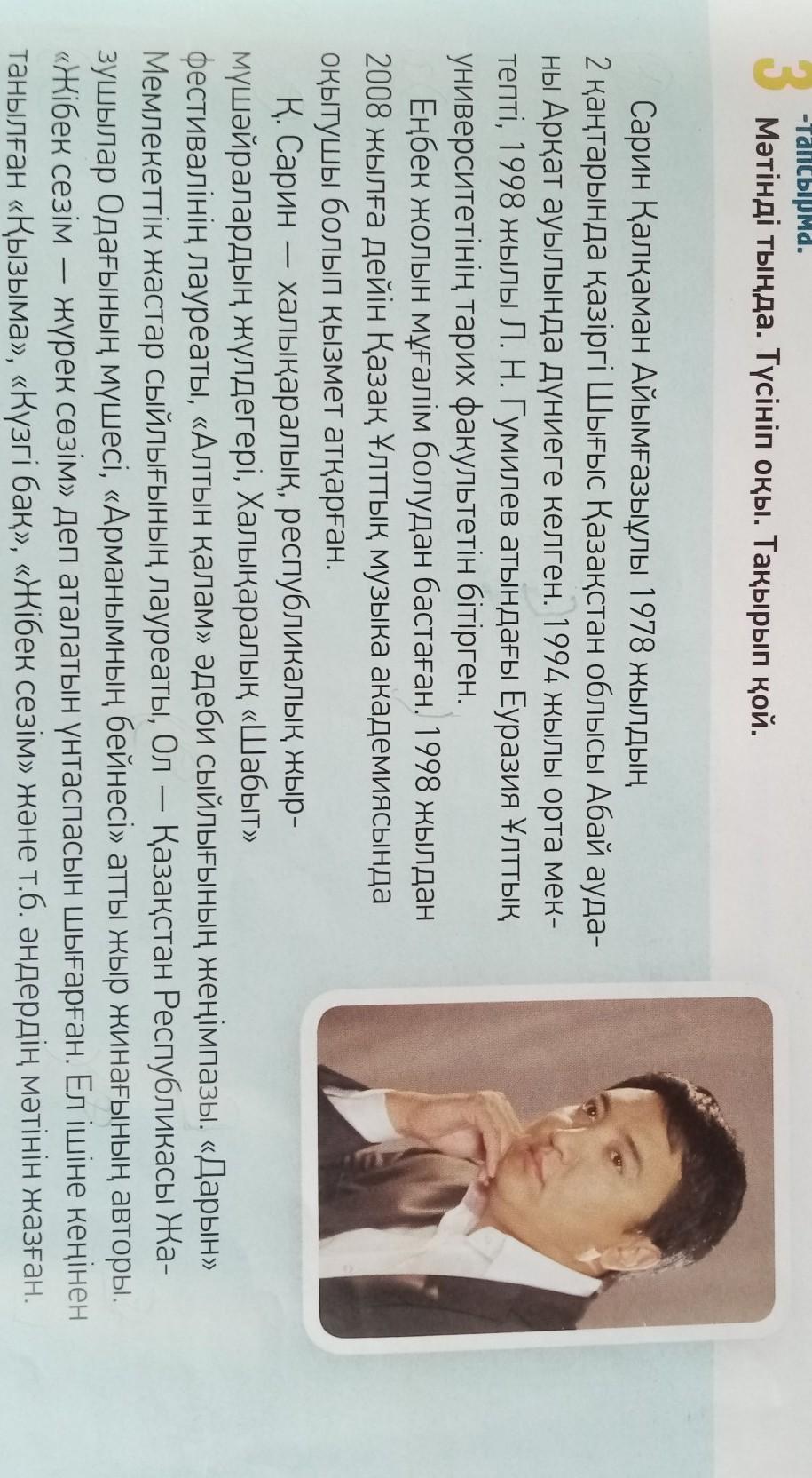 1 тапсырма. 37-бет, 3-тапсырма Мәтінді оқып, көп нүктенің орнына сөздерді қойып жаз. Серик Қалмақан Айымғазыұлы дүниеге келген. Еңбек жолын ... болудан бастаған. Қ.Сарин — халықаралық, республикалық жыр-мүшәйраларының ... , «Алтын қалам» әдеби сыйлығының