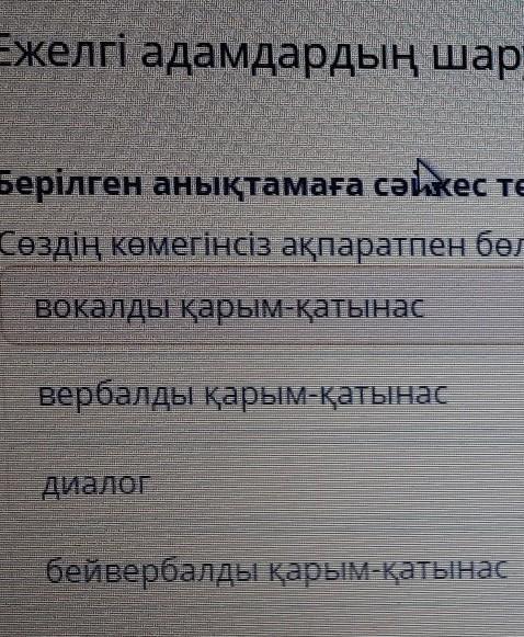 Берілген анықтамаға сәйкес терминді көрсет. вокалды қарым-қатынас, вербалды қарым-қатынас, диалог бейвербалды қарым-қатынас.